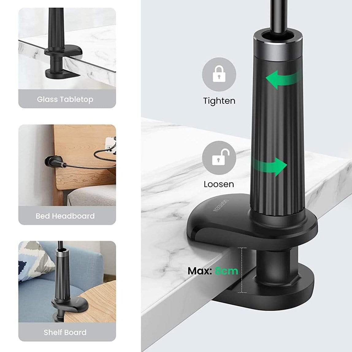 Easy to Use: Place the base clamp on a strong surface and twist the knob to tighten/loosen the clamp. The clamps are provided with anti-slip layers on both sides to avoid any damage to the holding surface.