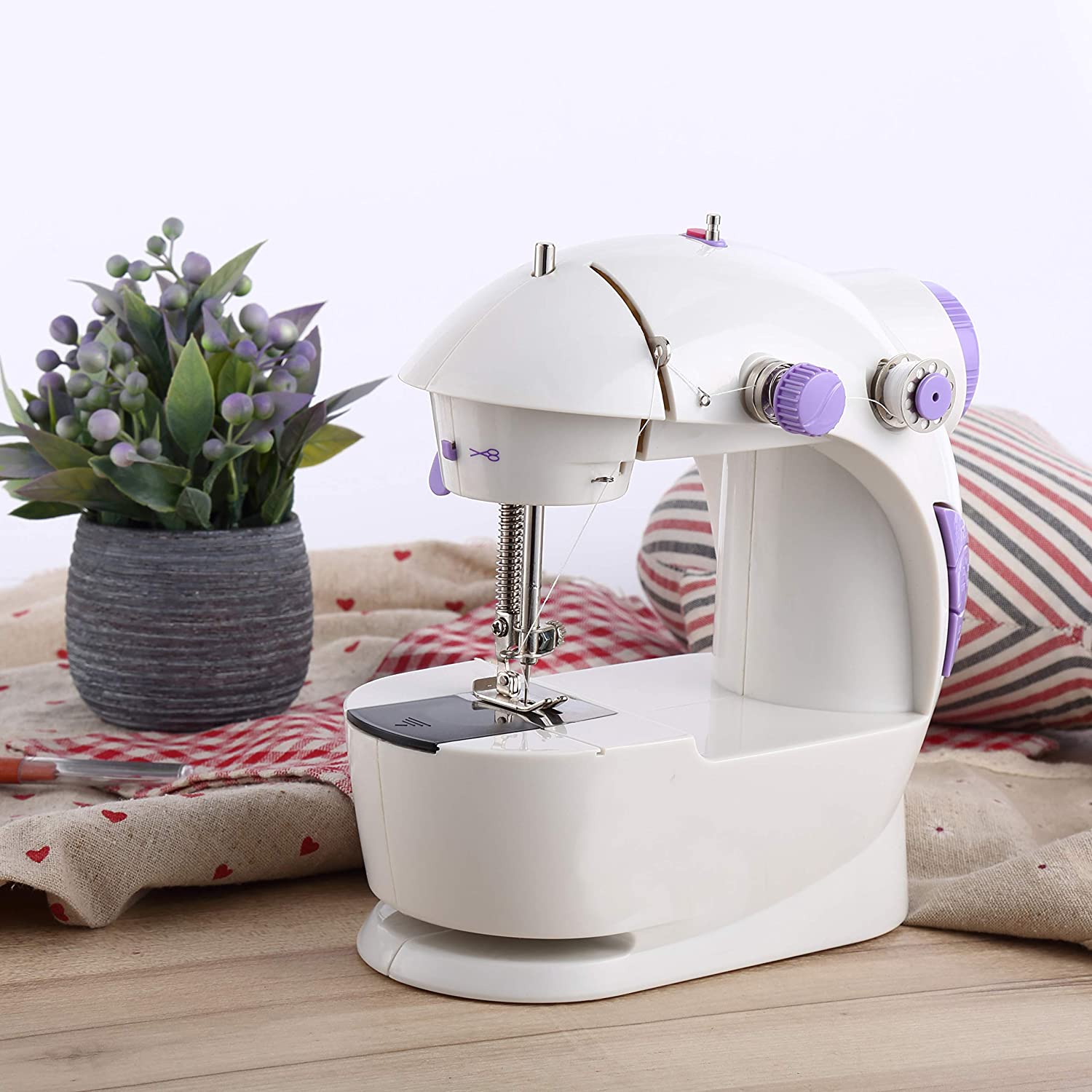 Easy to Operate: Can be used easily by all beginners, and professionals. Equipped with a thread cutter, it allows you to adjust the tension and speed as preferred, making the job easier. Dual Powering Methods: It can be powered by both household chargers or with 4 AA batteries. So if you need to use it outside your home, simply pop in the batteries and power it up.